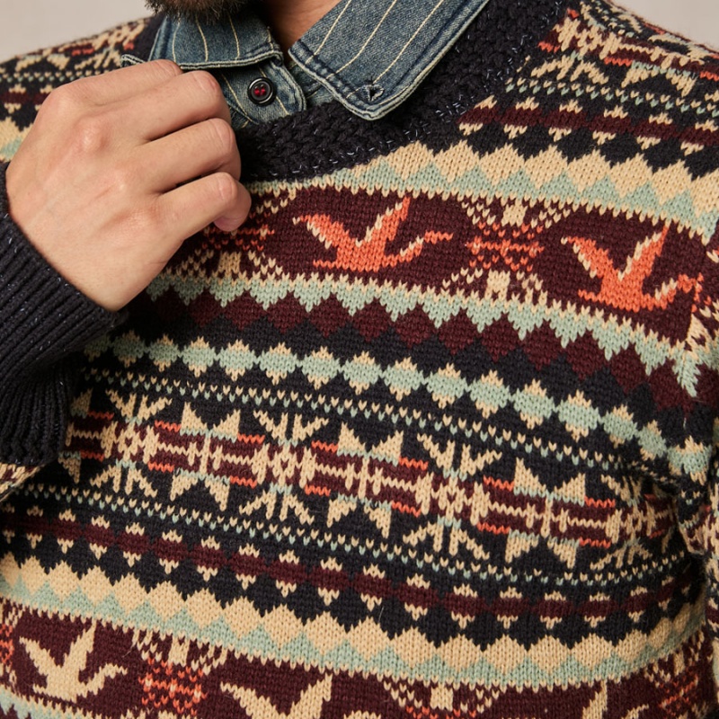 The Fair Isle crew-neck jacquard men’s sweater pictured here boasts a distinctive and unique style.