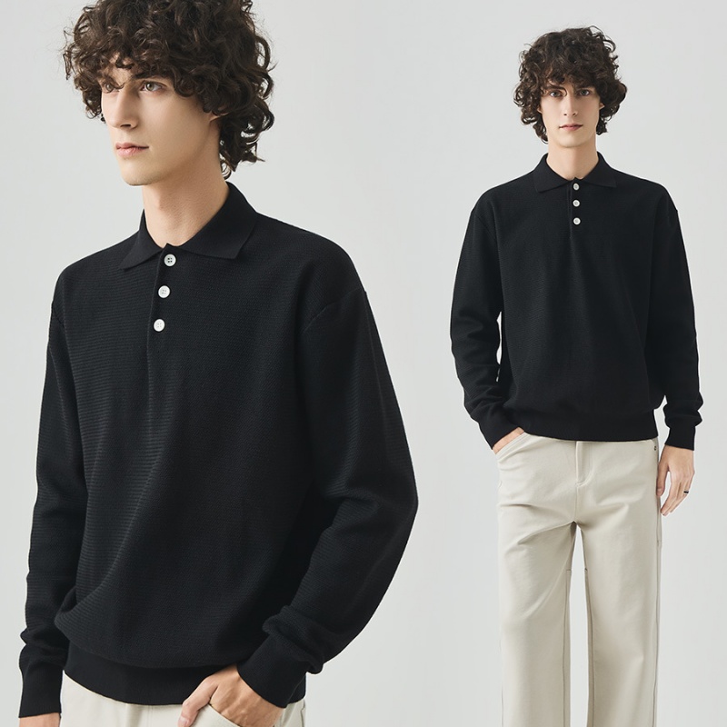 Ova opuštena, lapel-style, long-sleeved polo sweater for men, prikazano ovdje, showcases its unique charm and quality in many ways.