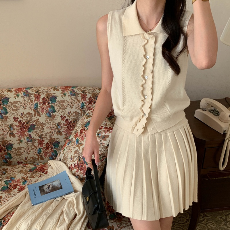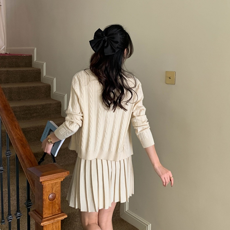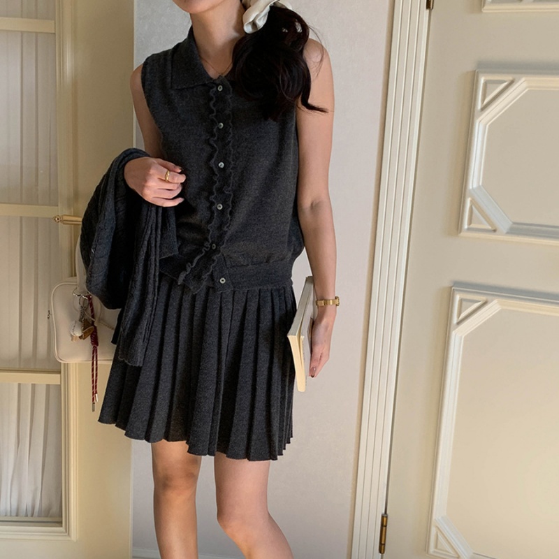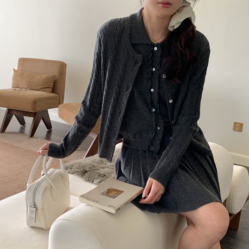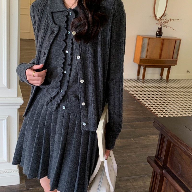 The three-piece style of the women's sweater set in the picture shows the perfect matching of the clothes. The sleeveless knitted vest features a baby collar style. The front of the door has a delicate black fungus edge design. A row of buttons are neatly arranged, and the material matches the garment. The pleated knitted short skirt is a classic pleated style. The knitted cardigan uses a twisted knitting technique to create a unique texture pattern. The overall cut is loose, and the off-the-shoulder sleeve design weakens the shoulder lines. The cardigan is of moderate length, just covering the area around the hips.