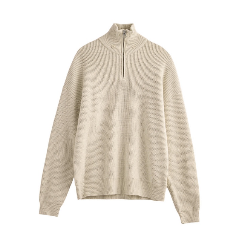 Zipper and Detailing: The half-zipper features a metallic zipper that is smooth, easy to pull, and resistant to rust, enhancing the overall quality and practicality. The button detail at the collar adds a layered feel to the simple design while also helping to secure the neckline, showcasing exquisite craftsmanship.