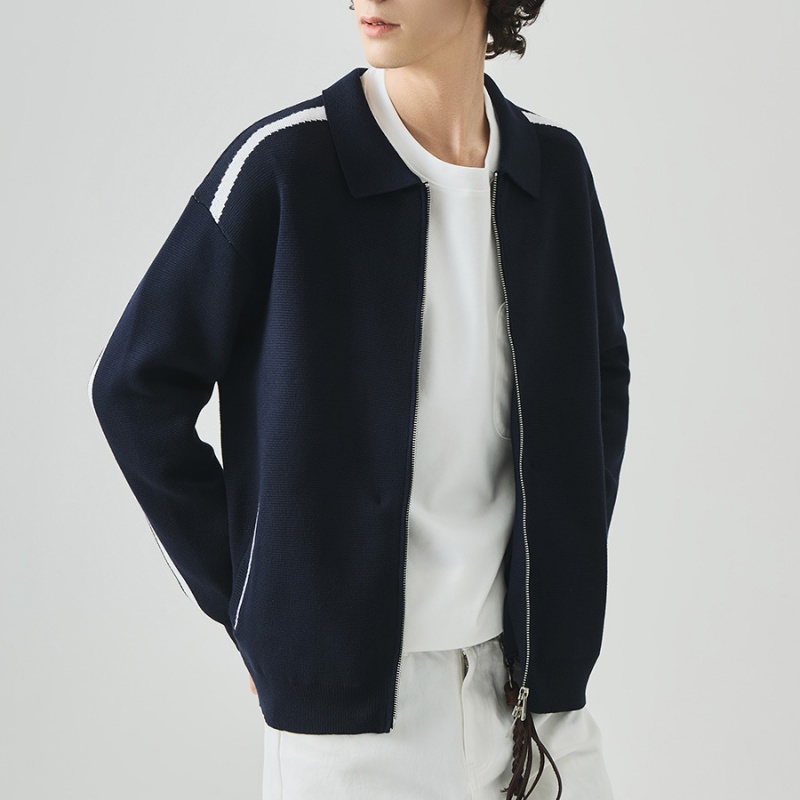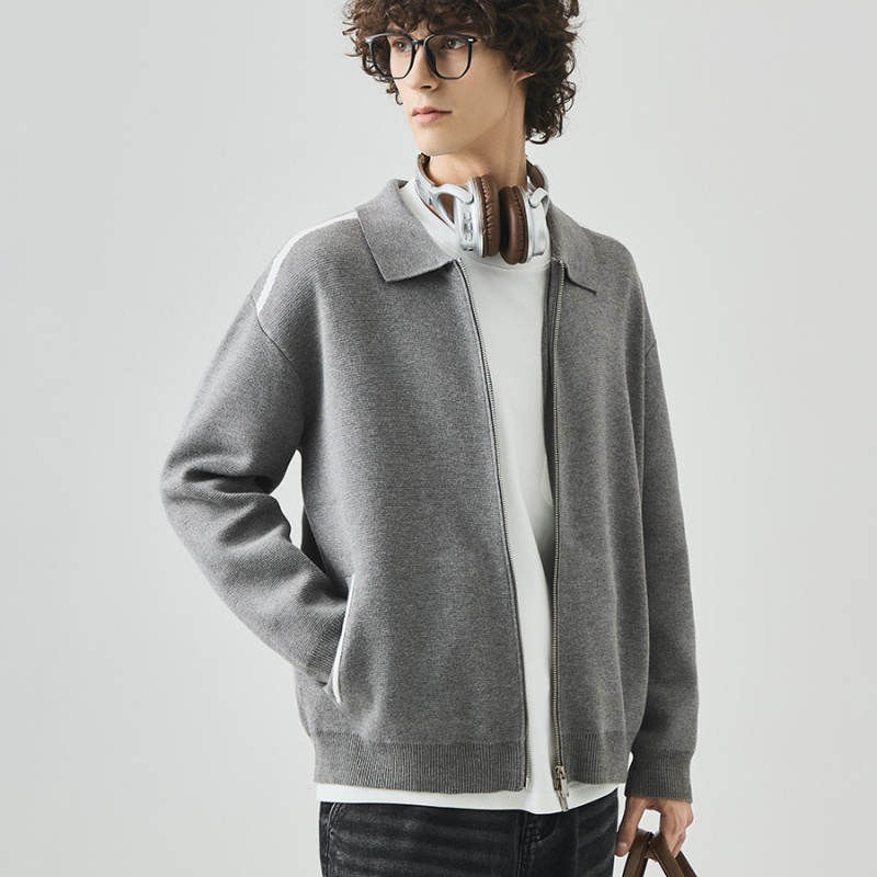 The contrasting zippered cardigan worn by the man in the picture is a lapel sweater. Below is a detailed introduction to this type of lapel sweater:
