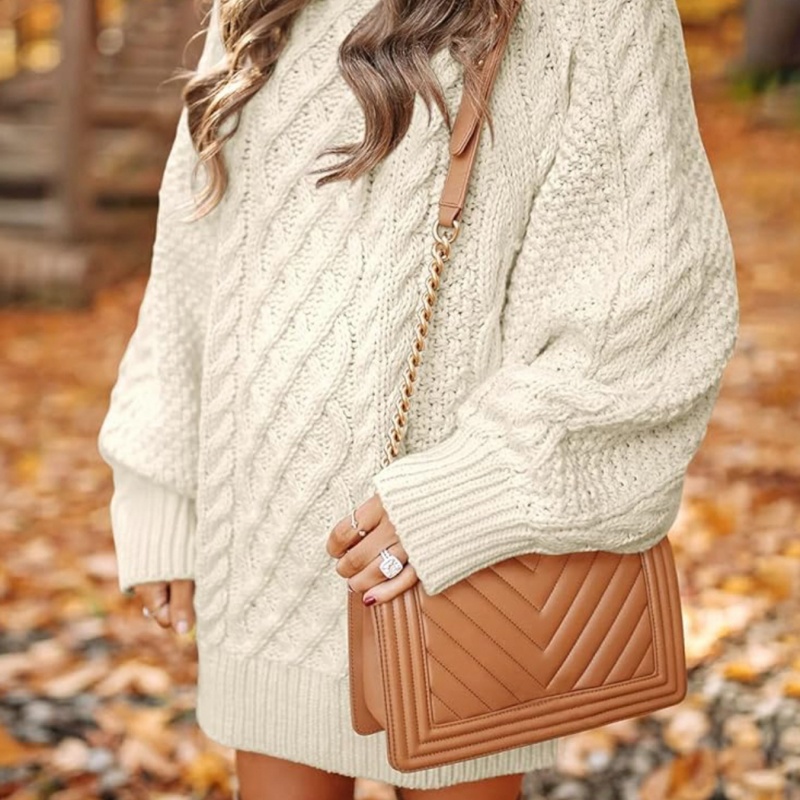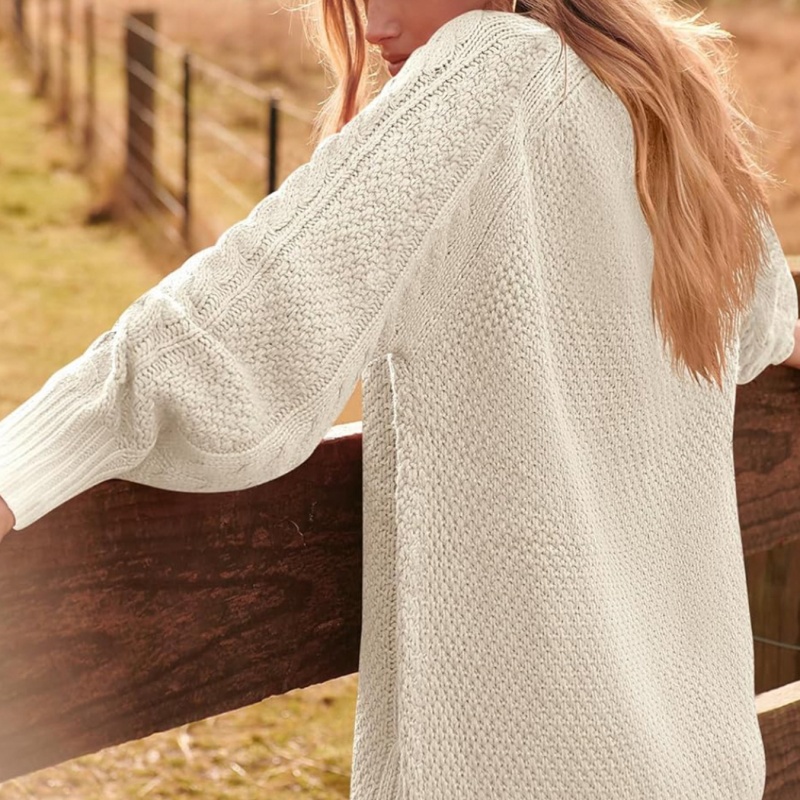 Main Texture: The main body of the sweater features a classic cable knit texture. This texture, created through complex stitching, has a three-dimensional and layered feel, enhancing the sweater’s texture and creating a slimming effect.