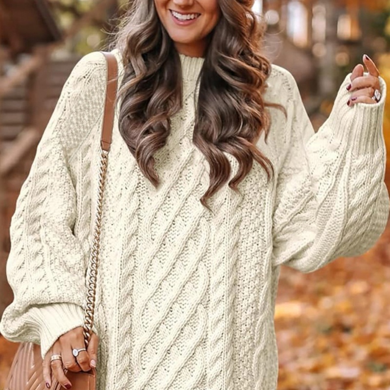 Šis apvalaus kaklo, kabelis-mezginys, mid-length women’s sweater is a comfortable and stylish piece for autumn and winter, exuding a relaxed and casual vibe.