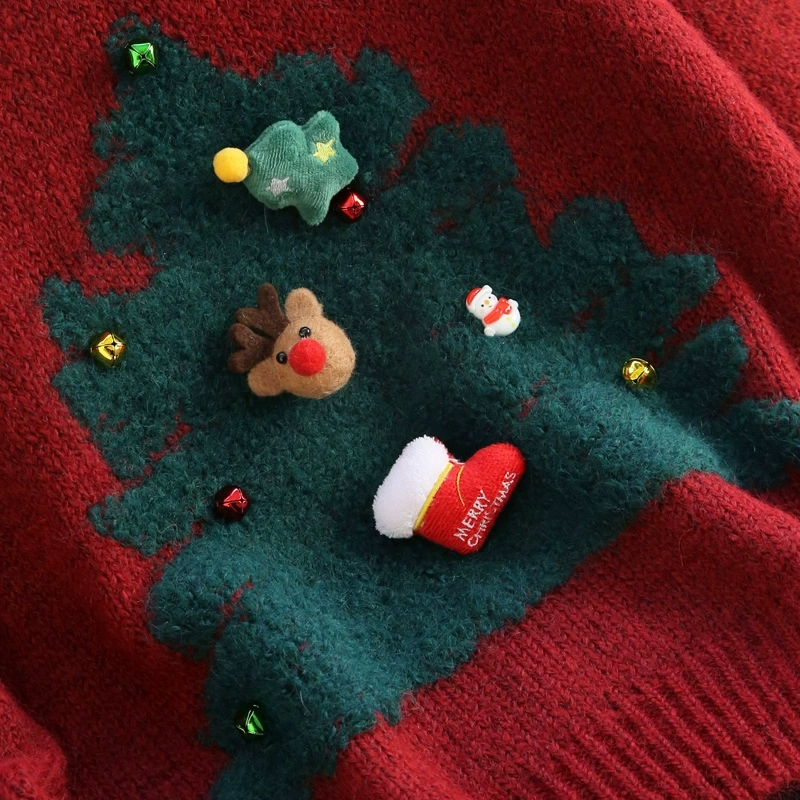 The front of the sweater Outlines the shape of a Christmas tree in green, the traditional color of the Christmas tree, representing life and hope. The Christmas tree is decorated with various elements full of Christmas characteristics: there are small colored bells, the sound of the bell seems to be able to convey joy in the festival; Reindeer decoration, Ko Reindeer te motuka a Santa Claus, playing an important role in Christmas legends, adding a mysterious fairy tale color to the holiday; Star-shaped ornaments, stars in the Christmas story is to guide the Magi to find the important symbol of the baby Jesus, meaning light and guidance; There are lovely Christmas stockings, Christmas stockings are the containers that children use to receive Santa Claus gifts on Christmas Eve, full of innocence and expectations.