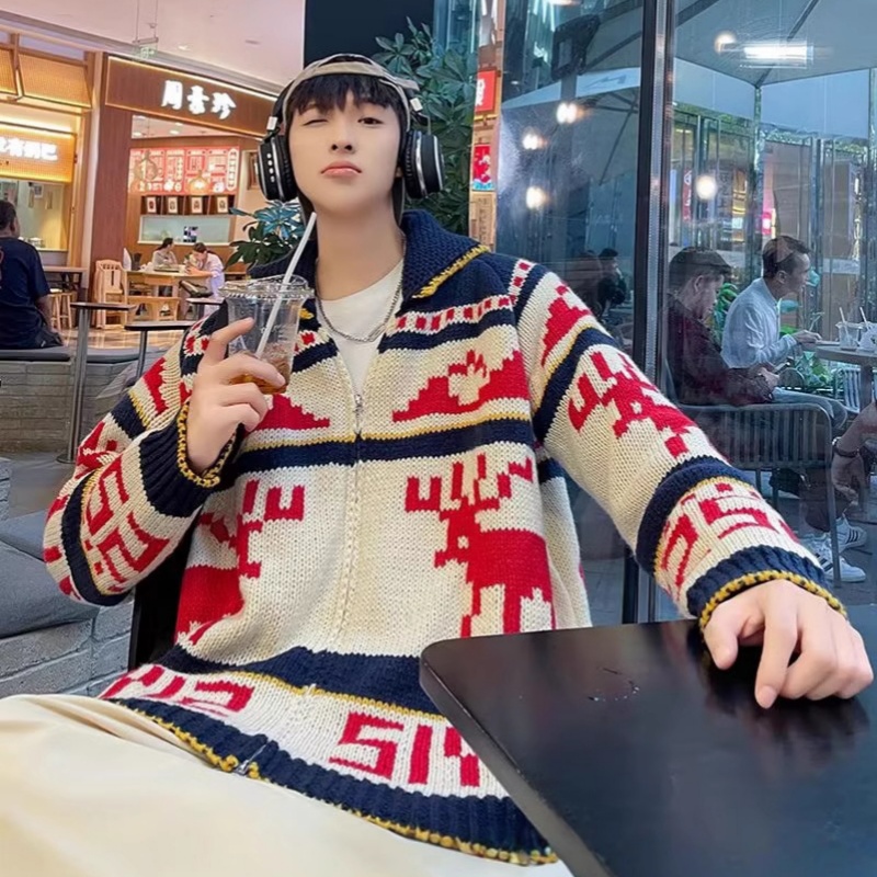 The zippered men’s Christmas sweater in the picture is unique and is a model of the fusion of fashion and festive atmosphere.