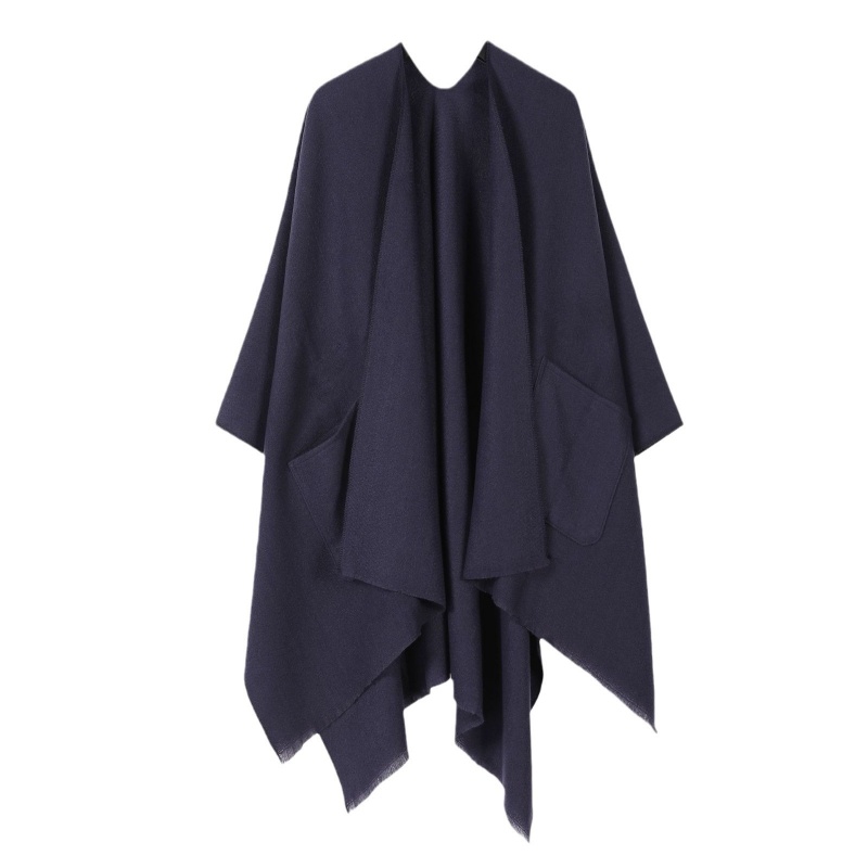 This is a cape-style knitted scarf accessory. It features a loose fit. When the neckline naturally droves down, it can accentuate the neck line. The large pockets on both sides are not only decorative elements but also highly practical. The hem is irregular and has a rough edge treatment, breaking the regularity of conventional clothing and making it more individual and trendy.