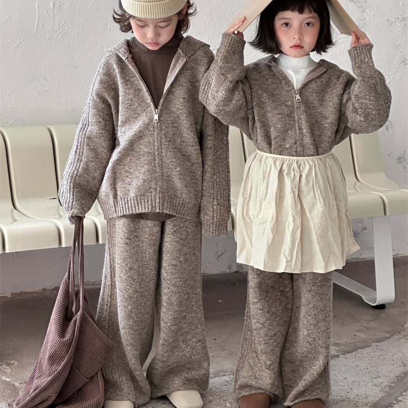 The body of the trousers is also knitted, echoing the woven texture of the top, and has a strong sense of unity. The leg part of the trousers may have adopted a straight or wide leg style, and the style was shaped by adjusting the number of stitches during weaving. The edges of the trouser legs may have adopted a ribbed finishing process, which has a certain degree of elasticity. It can not only prevent cold wind from entering but also facilitate children’s movement, and at the same time enhance the aesthetic appeal of the clothing.