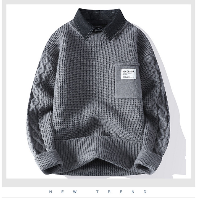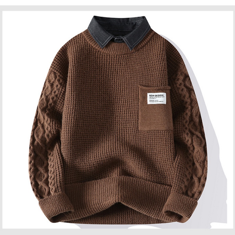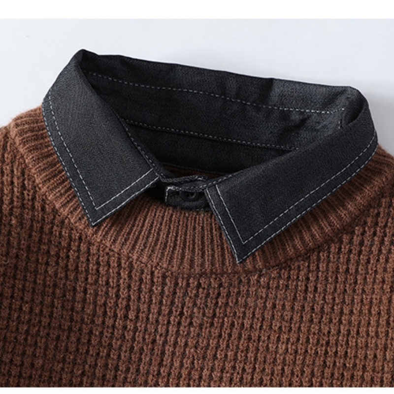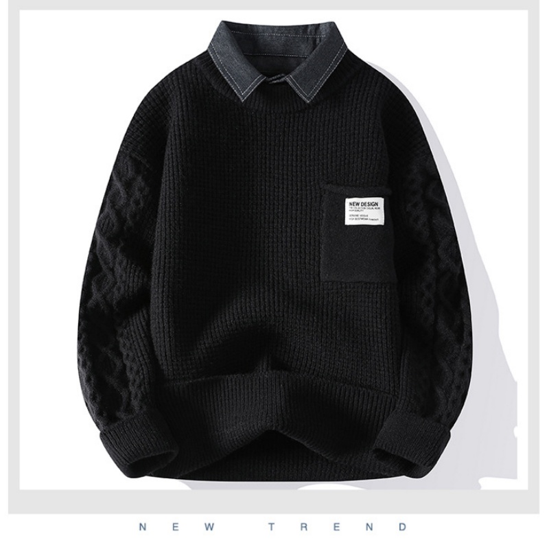 This men's sweater is ingeniously designed and has a unique fashionable style.. The collar part is made of black denim fabric and spliced together. This ingenious design breaks the monotony of the whole piece and adds a touch of ruggedness and casualness to the sweater, making it have a bit of unrestrained personality in the casual style.