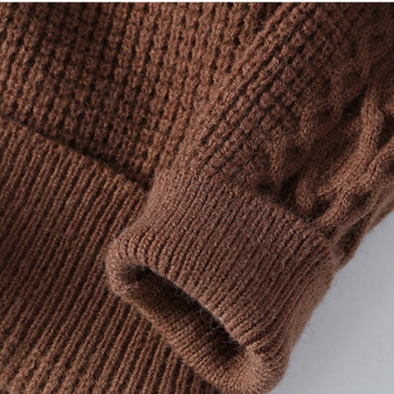 The sleeve part uses the braided braid weaving pattern, this traditional and exquisite weaving technique injects retro charm into the sweater, complementing the checkered texture of the main body, enriching the visual hierarchy and showcasing the delicate design ingenuity. Overall, this sweater perfectly integrates different materials, weaving techniques and decorative elements, suitable for pairing with jeans to create a casual street style, or combining with casual pants for daily outings or social occasions, highlighting the wearer’s unique fashion taste.