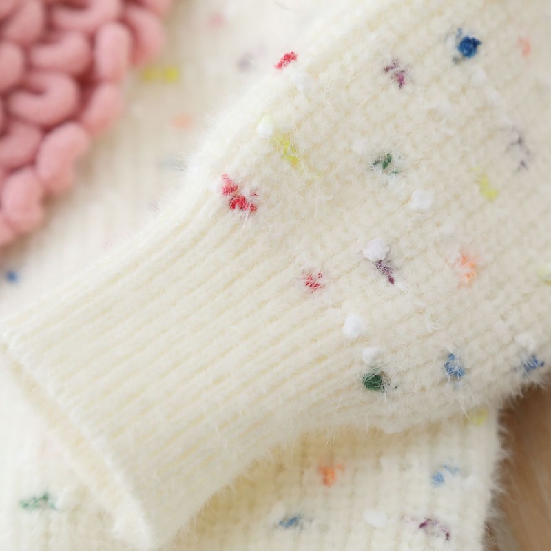 The picture shows a lovely children’s sweater. It features a round-neck design, which is both warm and comfortable. The surface of the sweater is dotted with small colorful embellishments, adding a lively touch. The most eye-catching part is the large pink three-dimensional heart pattern on the chest, which is made with a special knitting technique. It has a rich texture and highlights sweetness and innocence. Such a sweater is suitable for wearing in the autumn and winter seasons. It not only keeps you warm but also allows children to show their cute and playful side. It is very suitable for both daily outings and family gatherings.