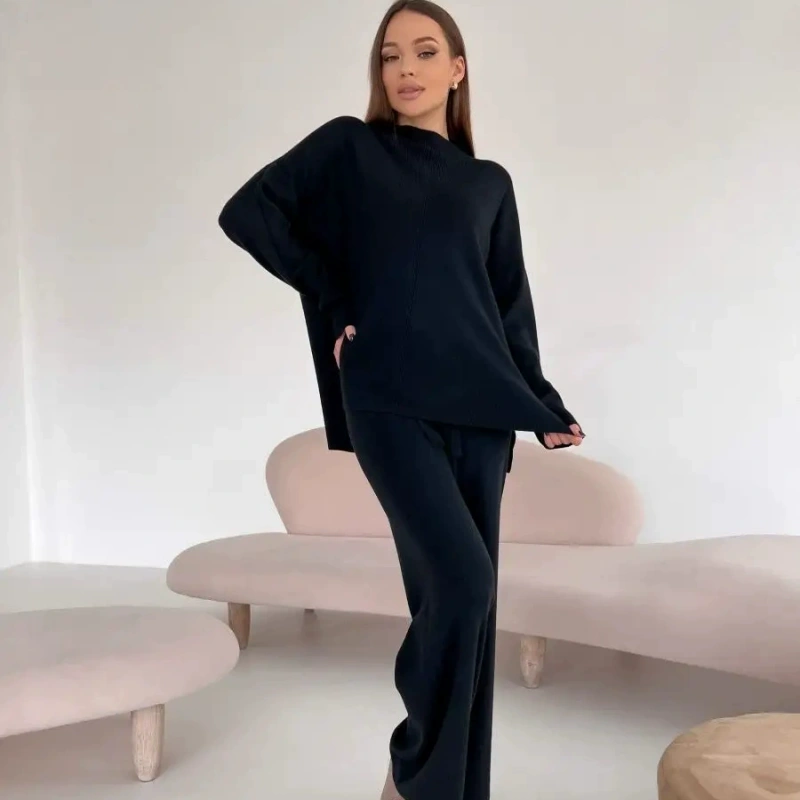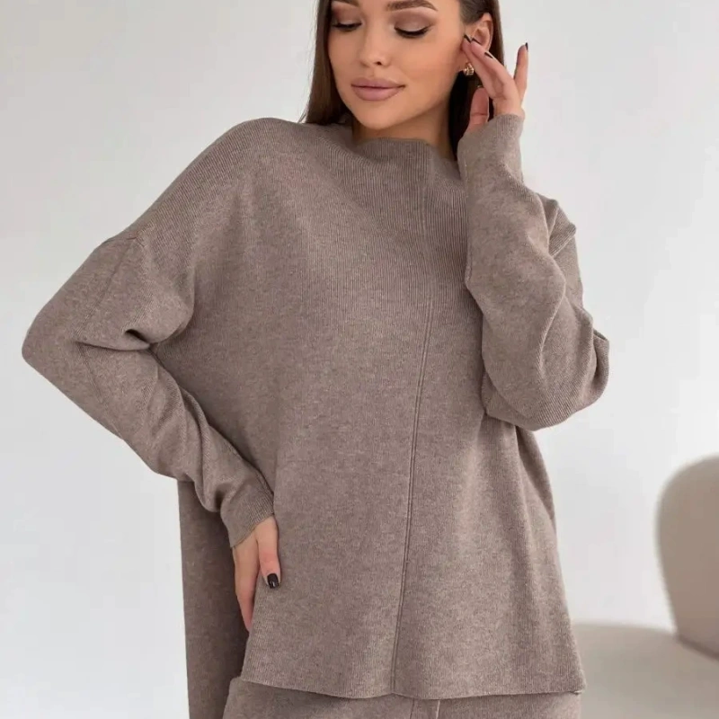 The women's sweater set with a mid-neck design is ingeniously crafted and exudes an elegant and casual atmosphere. The mid-neck feature not only provides warmth protection for the neck in cold weather, but also the vertical lines on the front are ingeniously designed, breaking the monotonous feeling of plain-colored clothing.