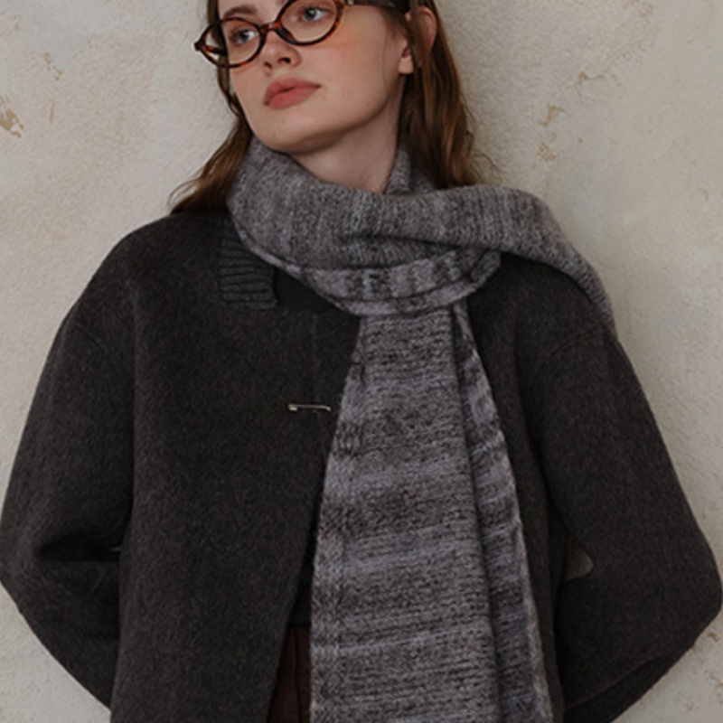 In terms of material, the scarf appears relatively thick. It is made of high-quality wool with excellent thermal insulation performance, which can provide good warmth in cold weather. Its overall shape is simple and elegant, with a moderate length and a good drape. It naturally hangs in front of the body and can be used as a practical item for daily warmth.