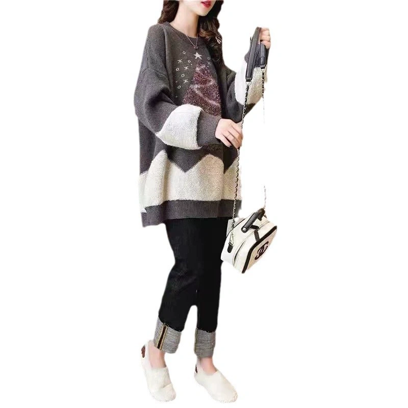 Prominently placed on the front of the sweater is a Christmas tree motif made of shiny material. The Christmas tree is the central symbol of Christmas, representing life and hope. The top of the Christmas tree is decorated with a star, which echoes the star of Bethlehem in the Christmas story that leads the Magi to the birthplace of Jesus, meaning light and guidance. Around the Christmas tree, dotted with stars and polka dots, further enhance the festive fantasy and cheerful atmosphere.