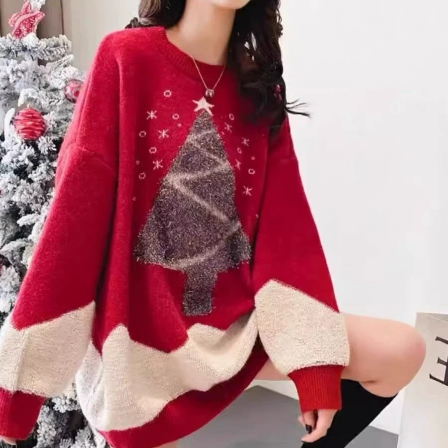 The picture shows a woman wearing a Christmas sweater. This sweater can be red, blue, gray as the main color, red in the cultural context of Christmas, representing enthusiasm, joy and warmth, is a classic color to create a festive atmosphere.