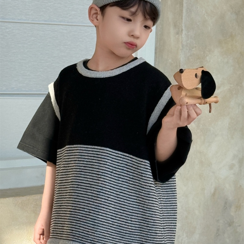 The fabric is knitted and has good breathability. Even when children wear it for a long time, they won't feel stuffy. The knitting texture is fine and the workmanship is meticulous. The seam of the stripe patch is smooth without obvious loose threads or flaws, reflecting a good production process and ensuring the quality and wearing comfort of the clothes.