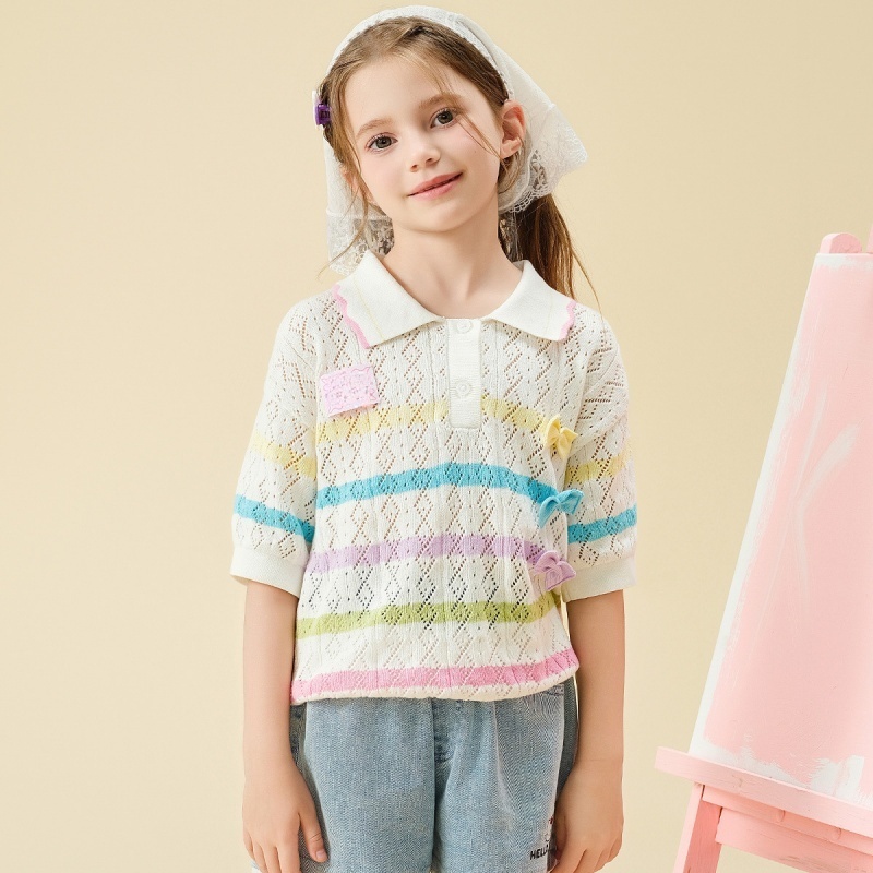 This children’s sweater is exquisitely designed, combining fashion and comfort. Judging from its style, it adopts the classic Polo collar design. The white collar is simple and elegant, not only adding a touch of grace to the overall look but also enhancing the neckline’s lines and presenting the childlike innocence and liveliness. The semi-open collar is paired with a few white buttons, making it convenient to put on and take off while also adding more details to the top. The short-sleeved design is suitable for warm seasons, allowing the child’s slender arms to be exposed, making movement more free and comfortable.