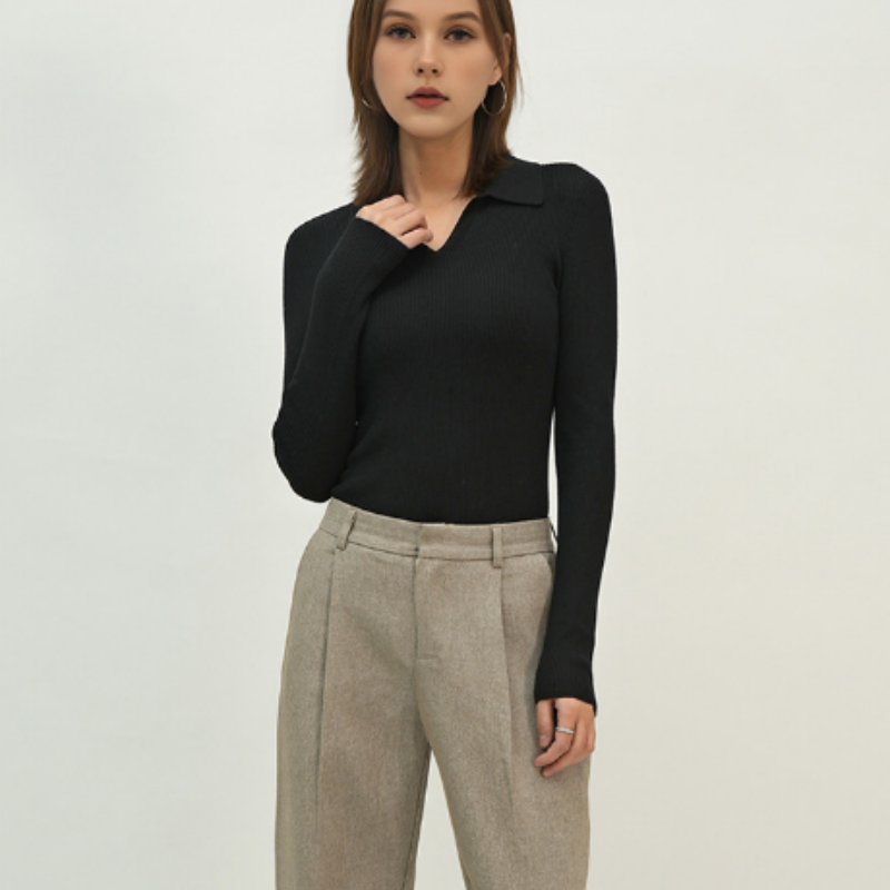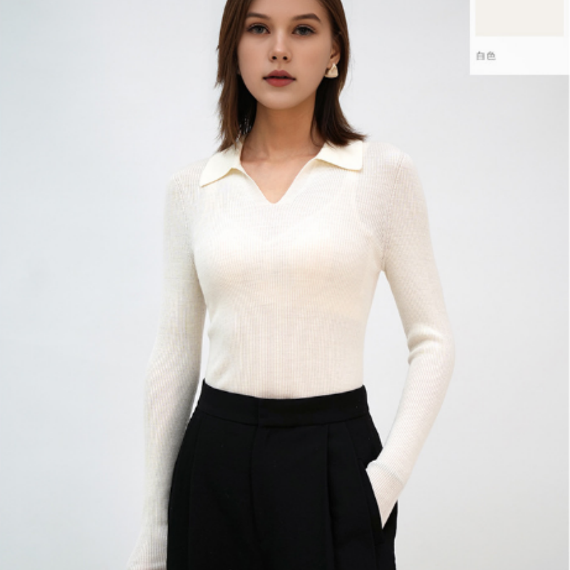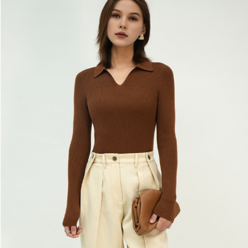 The model in the picture is wearing a women’s sweater with a design combining a lapel and a V-neck. This not only elongates the neck line visually but also adds a touch of delicacy and elegance to the overall look. The fitted style perfectly conforms to the body curves, presenting a graceful figure of a woman and also highlighting an elegant and wise temperament.