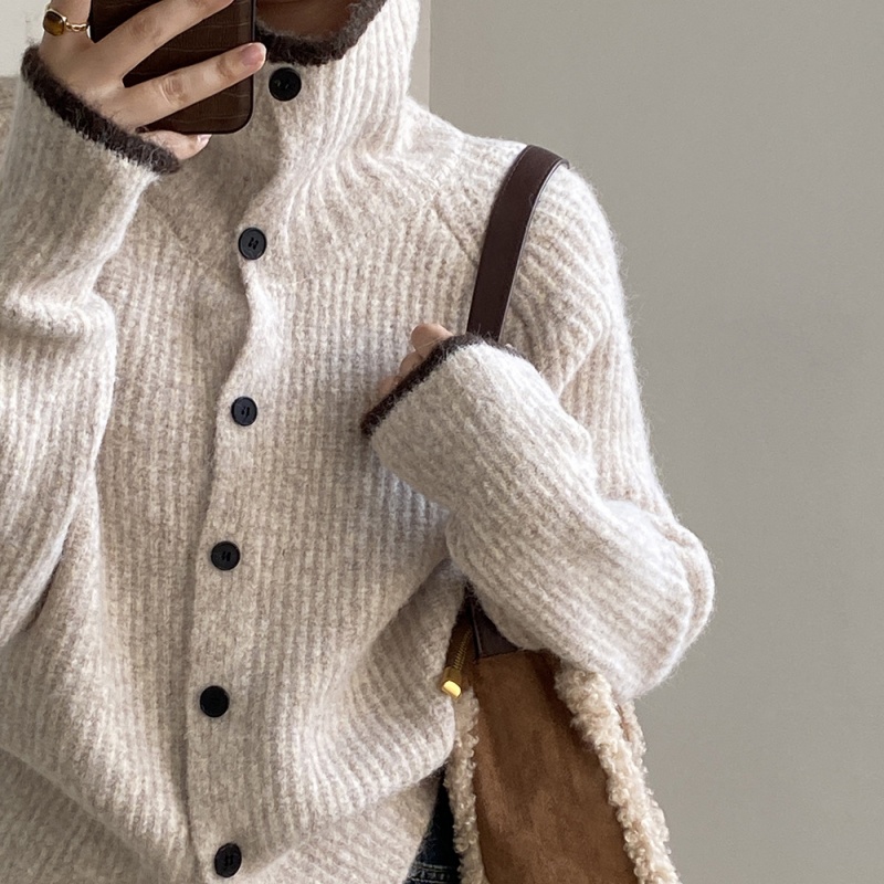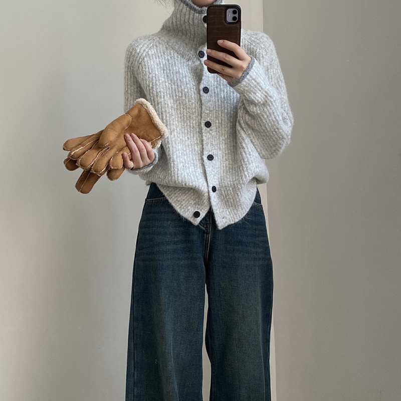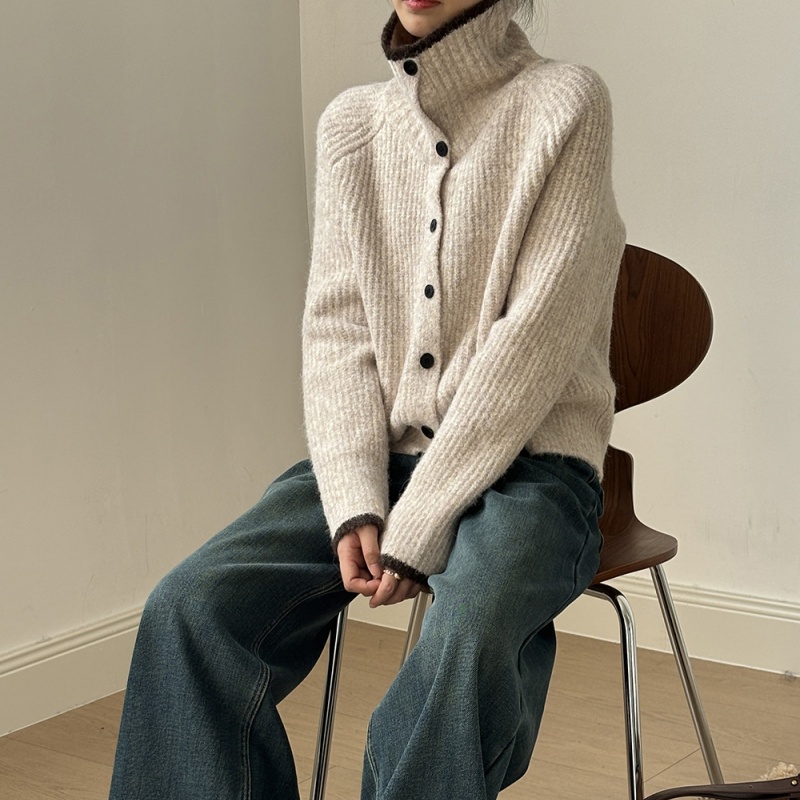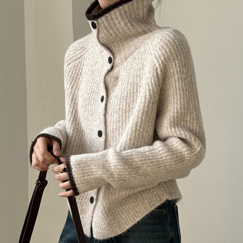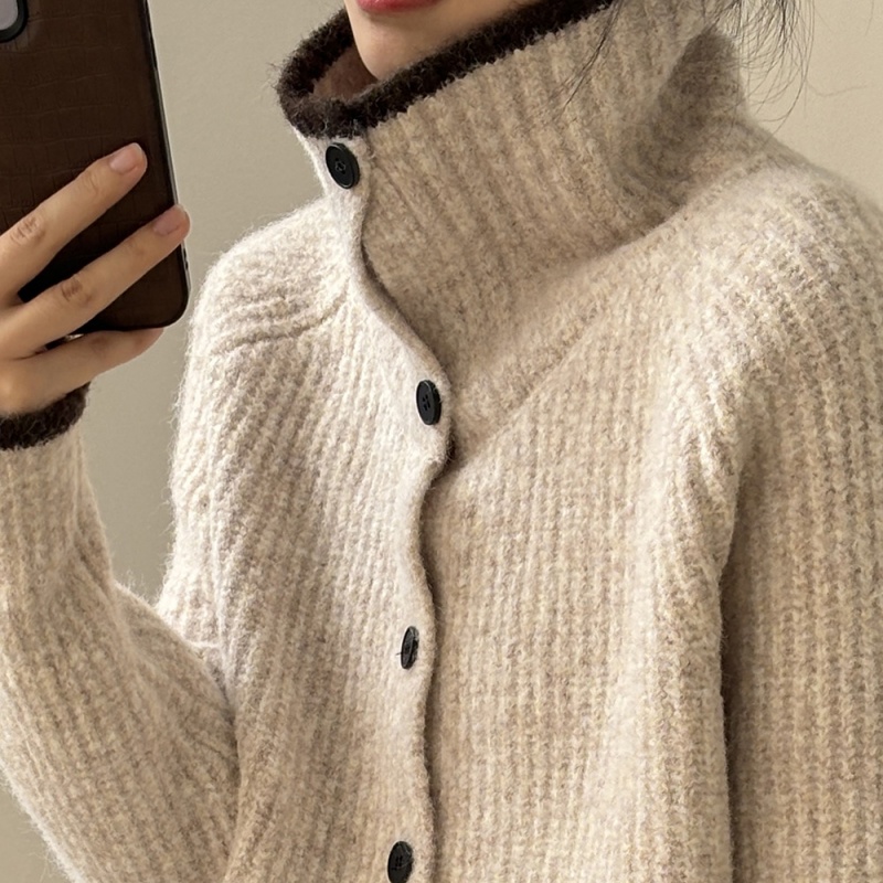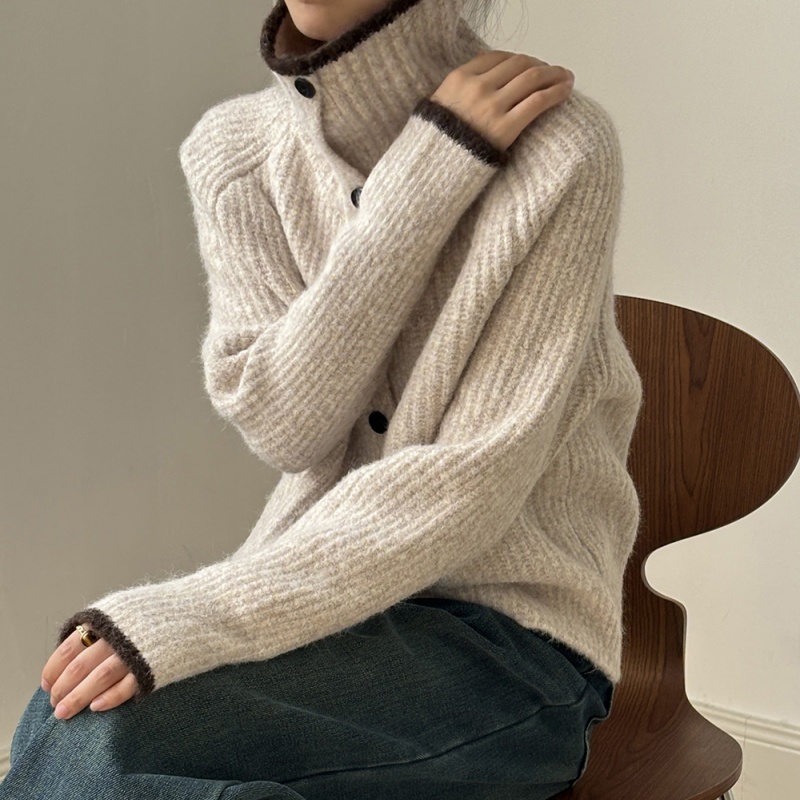 This picture presents a women’s sweater with a high collar and knitted design. This sweater is made with thick knitted fabric, presenting a clear texture and a thick feel. There are color-matching patterns on the collar and cuffs edges, enhancing the details. On the front of the sweater, there are black buttons arranged vertically. It is worn with dark blue jeans. The overall style is simple and casual, yet it retains a warm and elegant temperament. It is suitable for wearing in autumn and winter, creating a relaxed and carefree atmosphere.