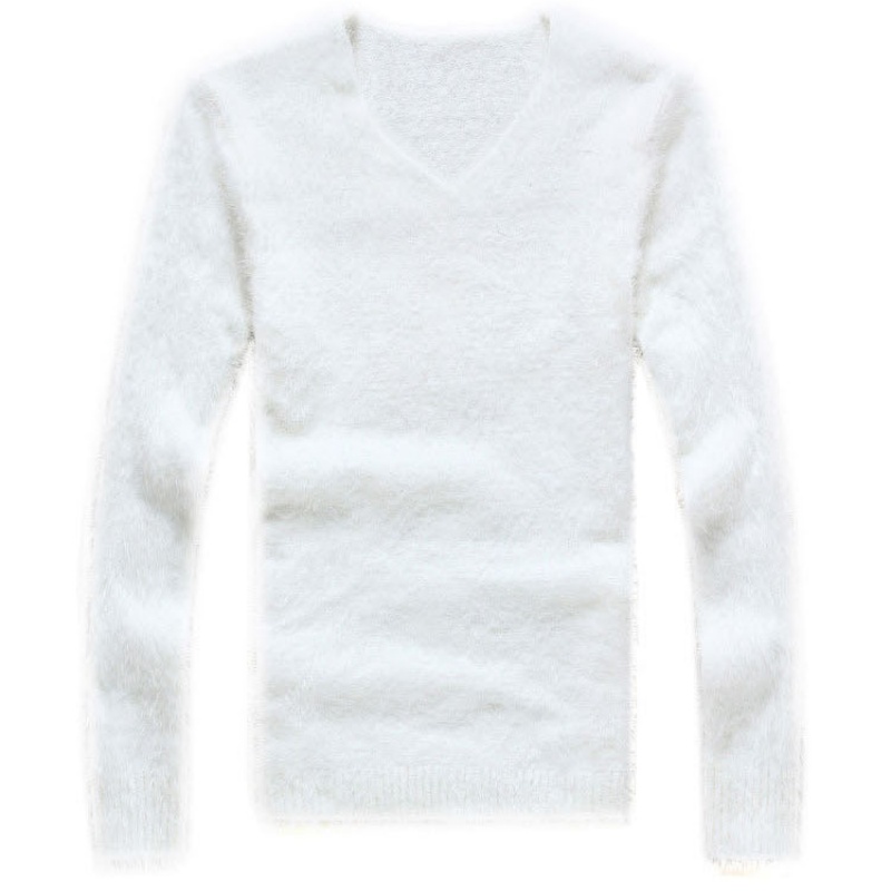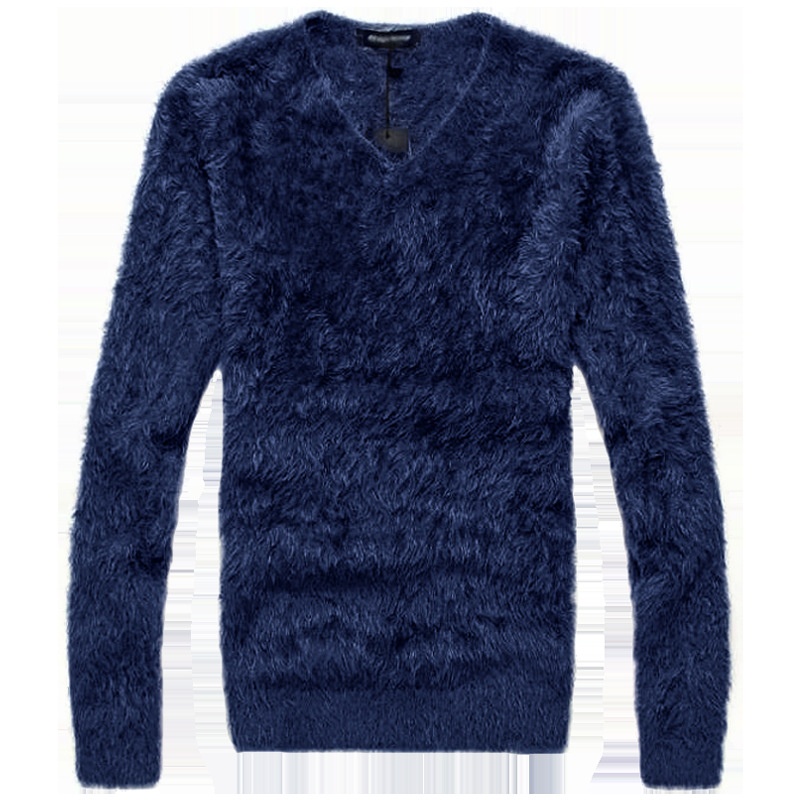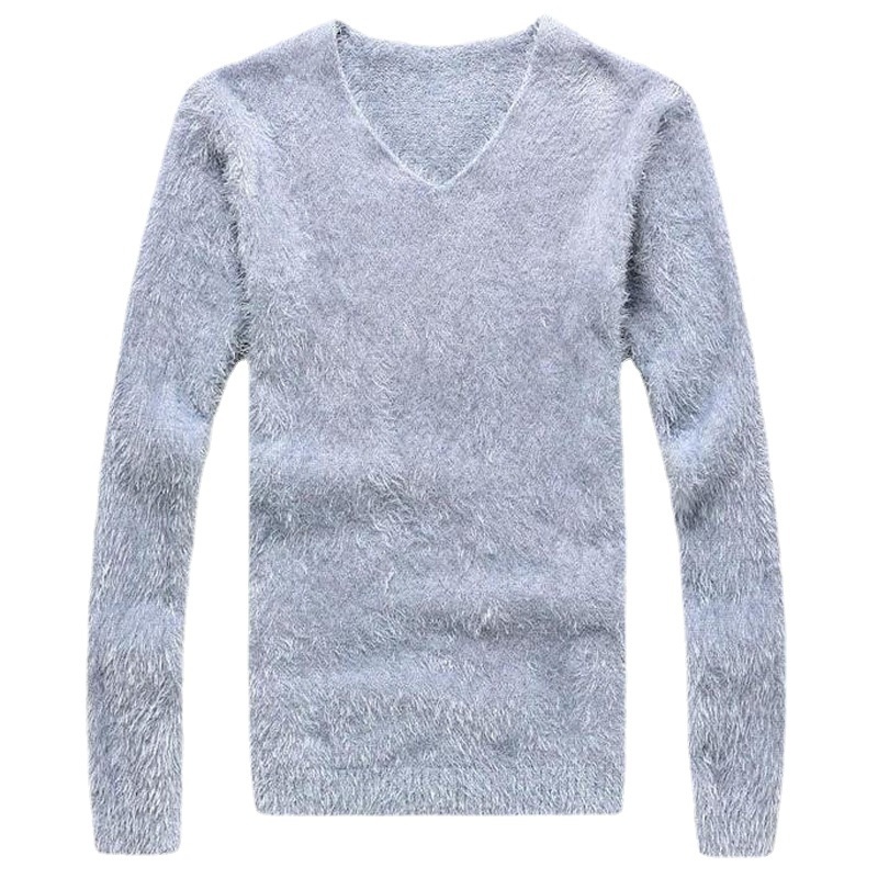 Bilden visar en faux minktröja för män, which is a perfect combination of soft touch and simple design. This men's sweater adopts a classic V-neck long-sleeved style. The overall version is a slim fit, but not too tight. It can fit the body curve just right, outlining the male figure and showing a capable and neat temperament. This sweater is made of faux mink material, which is usually made of chemical fibers such as acrylic and nylon mixed with a small amount of natural fibers (such as wool, spandex, etc.). Kragen, cuffs and hem are ribbed. The rib has good elasticity and can fit the neck, wrists and waist. This faux mink sweater for men has become a basic item that combines practicality and fashion with its classic style, comfortable material and fine craftsmanship.