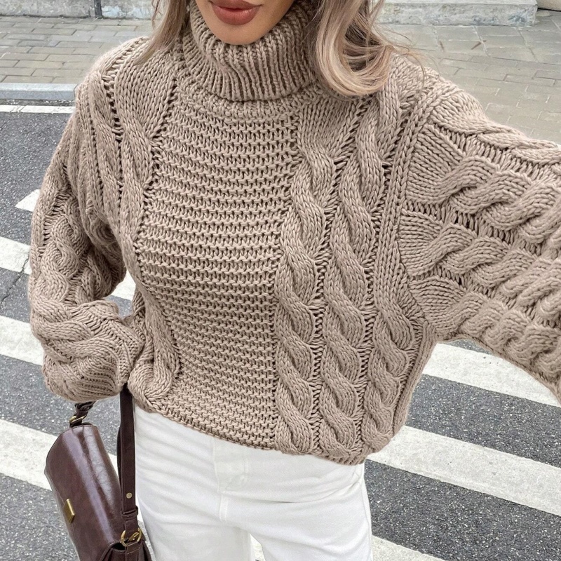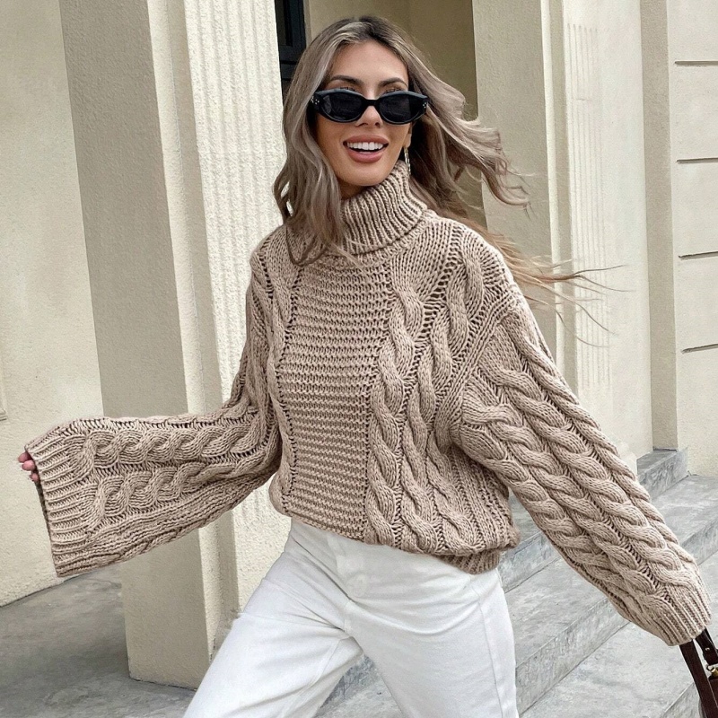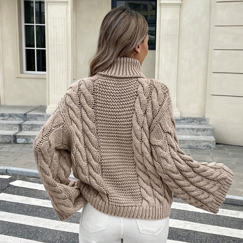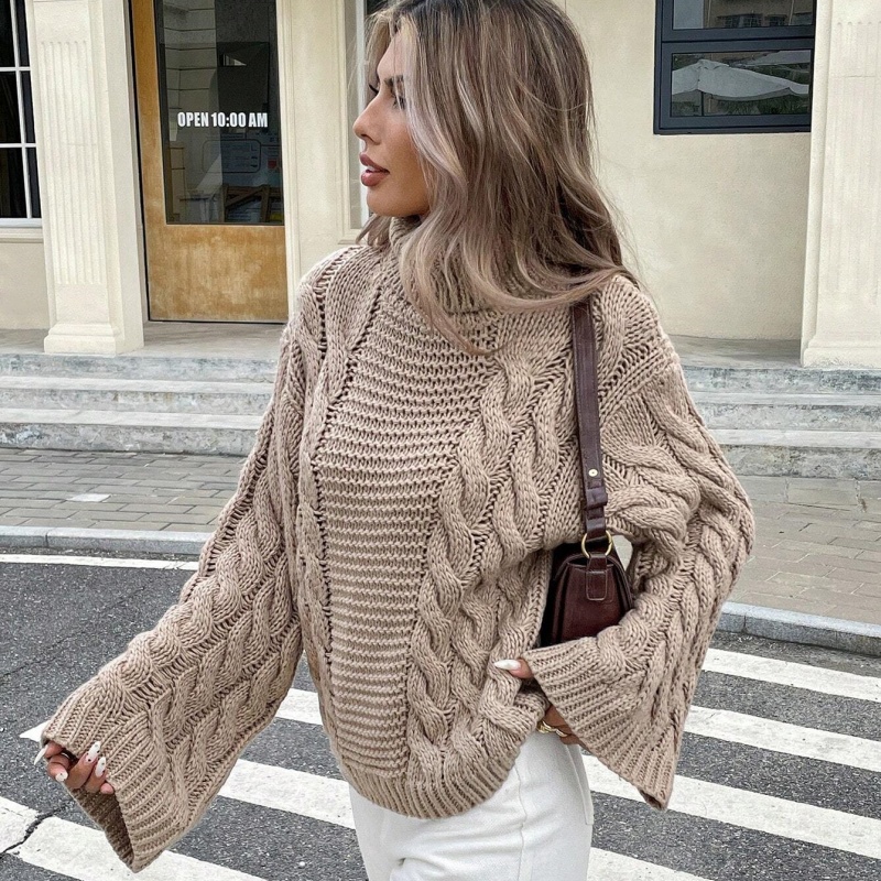 This cable-knit, bell-sleeve turtleneck sweater is a perfect autumn/winter piece that combines retro style with fashionable flair. From its design to its craftsmanship, it perfectly captures the relaxed yet sophisticated trend. Here’s a detailed analysis: The turtleneck (foldable) design retains warmth for autumn and winter while creating a casual vibe through the folded collar. The overall silhouette is short and loose, with the length concentrated around the waistline. Pairing it with high-waisted pants/skirts optimizes body proportions, while the slightly oversized cut adds a relaxed feel, making it flattering for various body types.