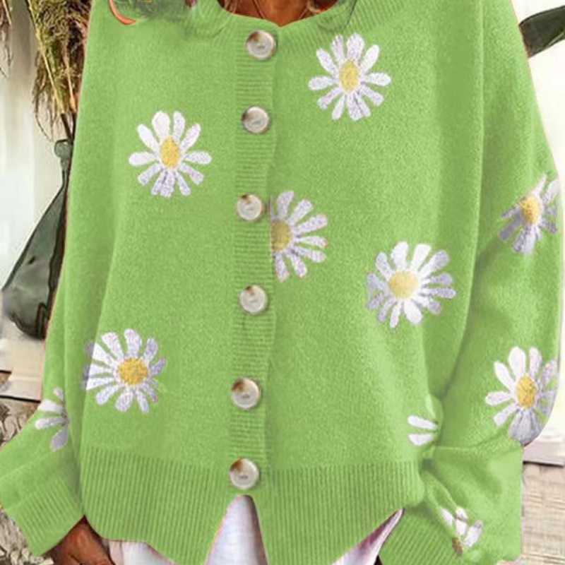 จุดเด่นอยู่ที่ลายปักดอกเดซี่: ดอกกระจัดกระจายตามลำตัวและข้อมือ, หลีกเลี่ยงความยุ่งเหยิงของงานพิมพ์ทั่วๆ ไป แต่สร้างความละเอียดอ่อนแทน, ความประหลาดใจที่น่ายินดี. กลีบดอกปักด้วยด้ายสีขาวและเกสรตัวผู้สีเหลือง, สีที่นุ่มนวลและกลมกลืน, ทำให้โทนสีโดยรวมสดใสขึ้นโดยยังคงรักษาบรรยากาศที่อ่อนโยนของฤดูใบไม้ร่วงไว้.